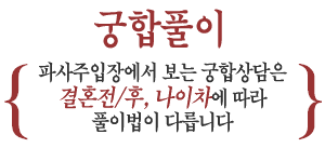 »ó´ã¿¡¼­µµ ÀÚÁÖ ÀÌ¿ëµÇ´Â ºÎºÐÀ̱äÇÏÁö¸¸ ÀÌ´Â ´Ü¼øÈ÷ ±ÃÇÕÁöħǥ¿¡ Áö³ªÁö ¾Ê½À´Ï´Ù. »çÁÖ»ó¿¡¼­´Â Á¤È®ÇÑ ±ÃÇÕ»ó´ãÀº ³²³àÀÇ »ý³â¿ùÀÏ »çÁÖÆÈÀÚÀÇ ¼º°ÝƯ¡À» ÆÄ»çÁÖÀÇ ±æ¿¬/¾Ç¿¬ÀÇ ÀÔÀå¿¡¼­ ÀçÇØ¼®ÇÏ¿© Ç®ÀÌÇϴ°ÍÀ» ¿øÄ¢À¸·Î ÇÕ´Ï´Ù.